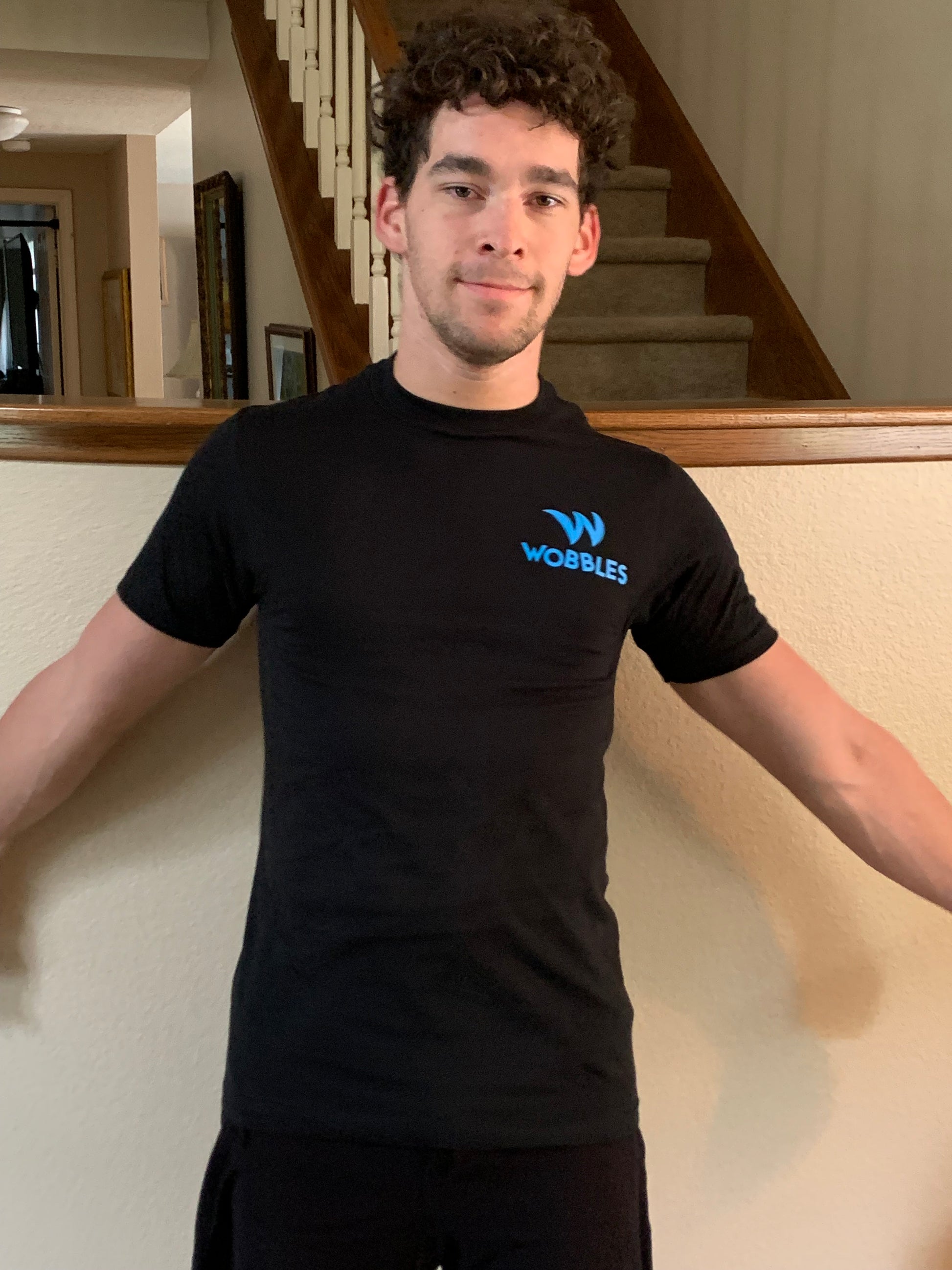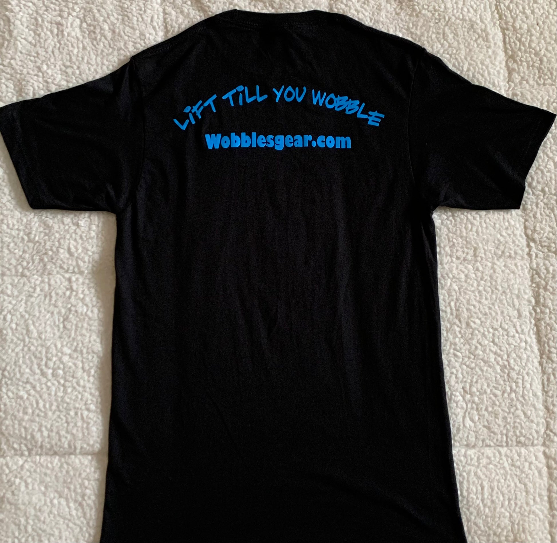 The Black Wobbles T-shirt is crafted from premium black fabric, offering durability and comfort for active wear. Featuring the bold "wobbles" and "Lift Till You Wobble" printed in vibrant blue ink, it combines style with motivation. Designed for performance and everyday use, this shirt supports your active lifestyle with a sleek, modern look.